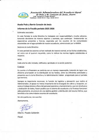 Como parte de nuestra politica de transparencia y rendición de cuentas, la Junta Directiva y la Fiscalía de la Asociacion Administradora del Acueducto de Poás y Barrio Corazón de Jesús de Aserrí presenta al público en general, los informes que se presentarán en la proxima Asamblea de Asociados el próximo sábado 07 de marzo del 2026.